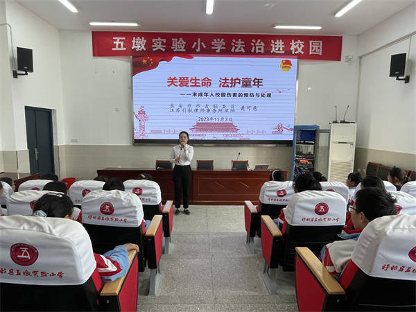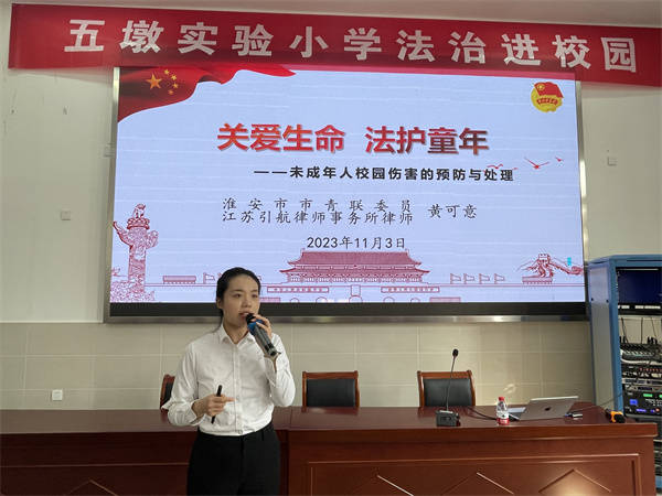 为切实提高学校师生的法律素养,逐步形成“知法、学法、用法、守法、护法”的良好氛围,11月3日上午,团县委联合江苏引航律师事务所,特邀事务所团支部书记黄可意律师走进了盱眙县五墩实验小学新校区,在校报告厅开展了“关爱生命 法护童年——未成年人校园伤害的预防与处理”主题宣讲活动。