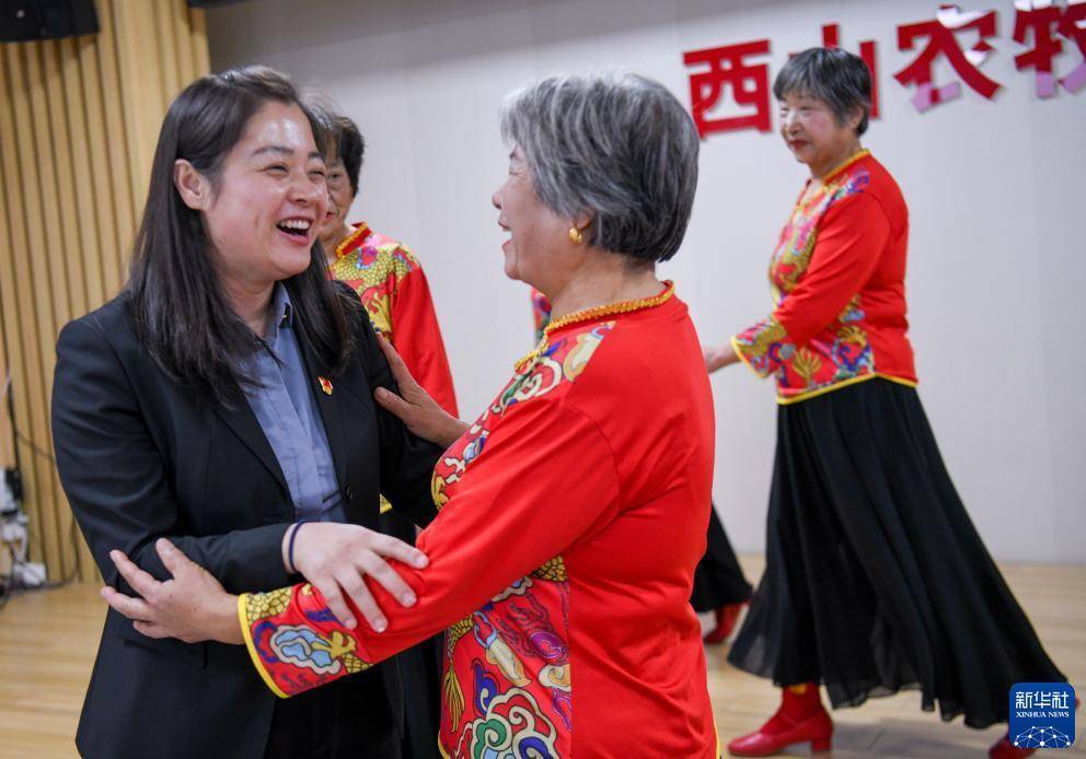 在新疆生产建设兵团第十二师西山农牧场安康社区的会议室内,社区党总支书记、妇联主席马丽(左)与排练舞蹈的居民交流(10月10日摄)。新华社记者 王菲 摄