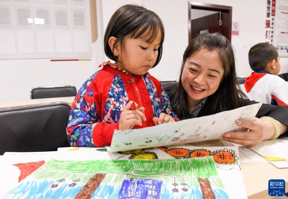 在新疆生产建设兵团第十二师西山农牧场安康社区的会议室内,社区党总支书记、妇联主席马丽辅导参加“六点半课堂”兴趣班的小朋友绘制美术作品(10月10日摄)。新华社记者 王菲 摄