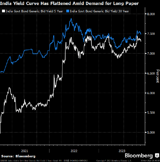 中产阶级不断壮大,推动印度人寿保险和养老基金行业蓬勃发展,当地1万亿美元主权债务市场的格局也在因此而改变。随着保险公司加大力度购买长期债券,即使政府举债创纪录,印度的收益率曲线仍近乎平坦。