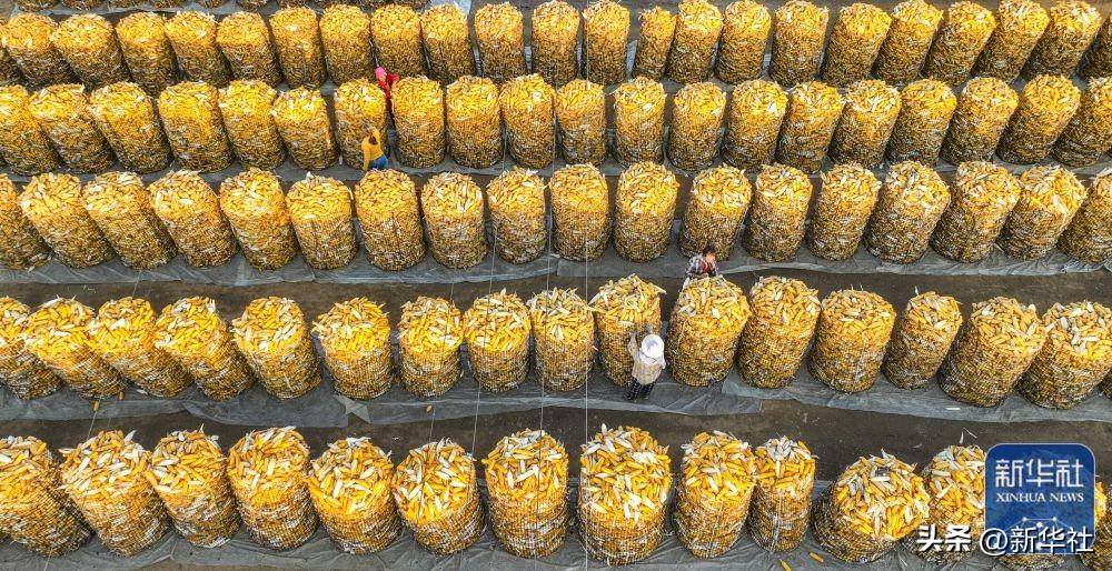 10月29日,河北省遵化市东新庄镇农民在整理收获的玉米(无人机照片)。新华社发(刘满仓摄)