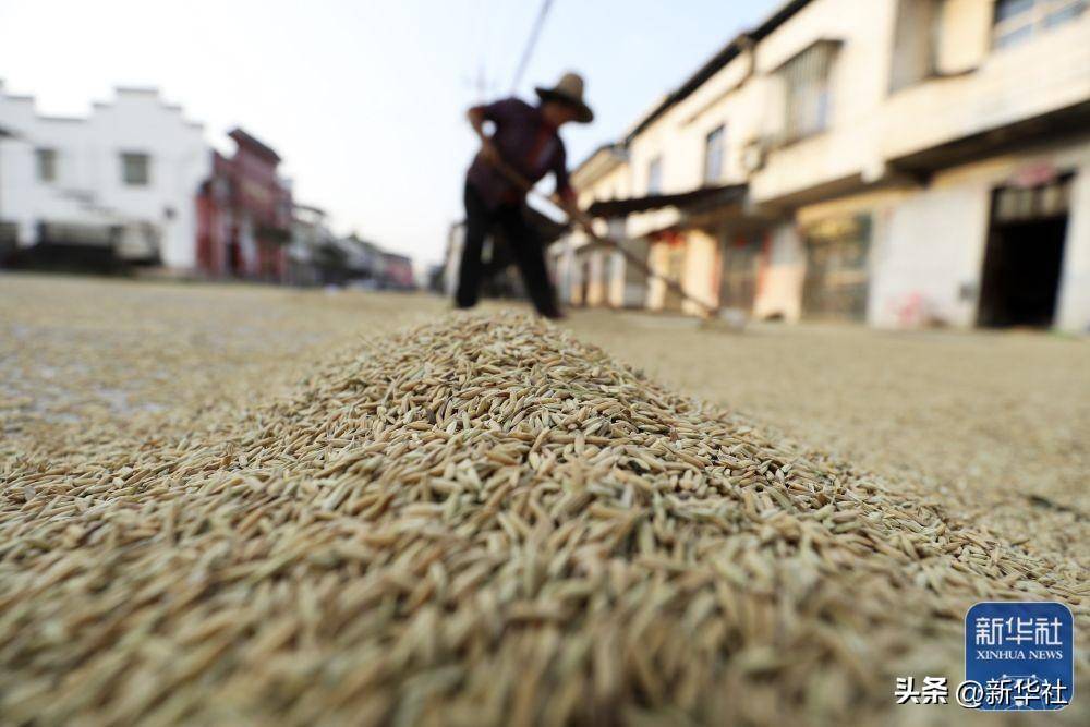 10月30日,在湖南省资兴市唐洞街道高码村,农民晾晒稻谷。新华社发(李科摄)