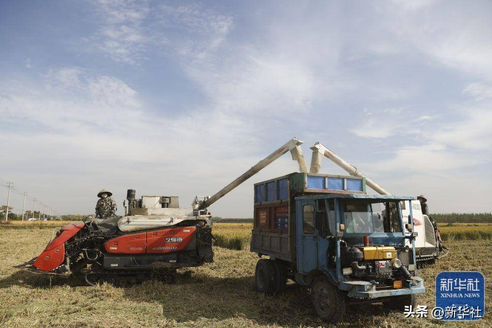 10月28日,在江苏省淮安市洪泽区三河镇,农民将收获的水稻装车。新华社发(万震摄)