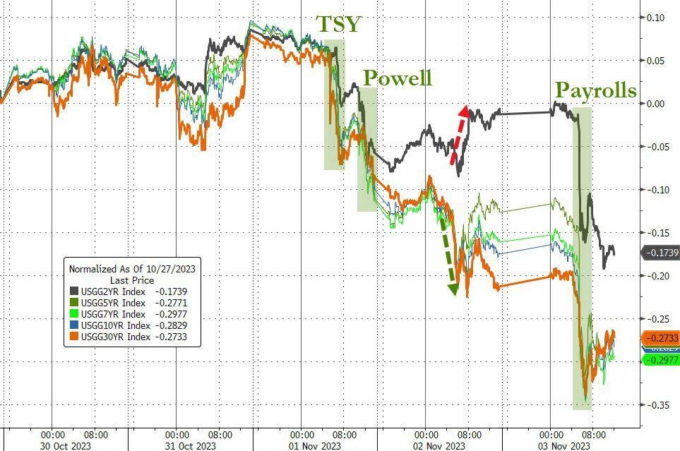 对利率前景更敏感的2年期美债收益率在欧股早盘曾短线升破5.0%刷新日高,美国就业报告公布后迅速下破4.90%,美股盘初曾下测4.80%,在连续两日创近两月新低后,又刷新两个月来低位,日内降近19个基点,到债市尾盘时约为4.84%,日内降约15个基点,抹平周四反弹的升幅,本周降约16个基点,降幅为上周的两倍多,和10年期美债收益率均连降两周。