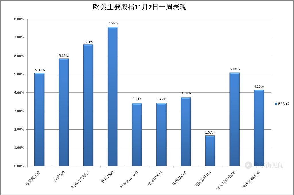 主要美股指本周集体累涨。连跌三周的纳指累涨6.61%;标普累涨5.85%,道指涨5.07%,纳斯达克100涨6.48%,都在连跌两周后反弹,道指创去年10月28日以来最大周涨幅,标普、纳斯达克100、纳指均创去年11月11日以来最大单周涨幅;罗素2000累涨7.56%,创去年6月24日以来最大周涨幅,扭转四周连跌势头。