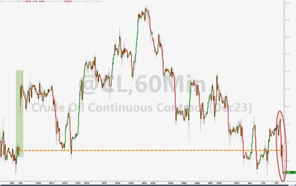 周四止住三连跌的国际原油期货回落,在美股盘前转跌后早盘曾短线转涨,午盘跌幅扩大,刷新日低时,美国WTI原油逼近80美元关口至80.1美元,日内跌近2.9%,布伦特原油跌至84.56美元,日内跌超2.6%。