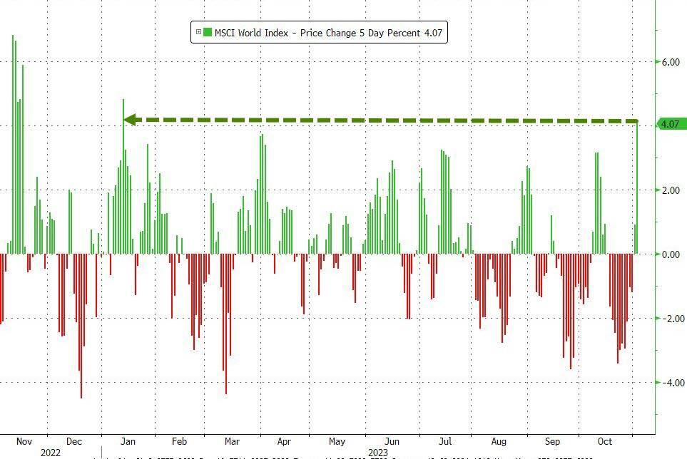 经济数据的坏消息成了股市的好消息,MSCI全球指数显示,全球股市本周五日创1月初以来最大五日涨幅。