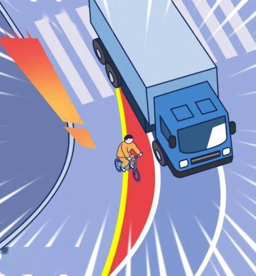 大车往往存在视觉盲区,因此走路、骑车,切勿在大车前方穿行,遇大车转弯、横向时,保持好安全距离,切勿抢先超越大车,待大车通过后,再通行。