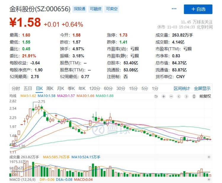 二级市场上,截至3日收盘,金科股份报1.58元/股,上涨0.64%,总市值84.37亿元。