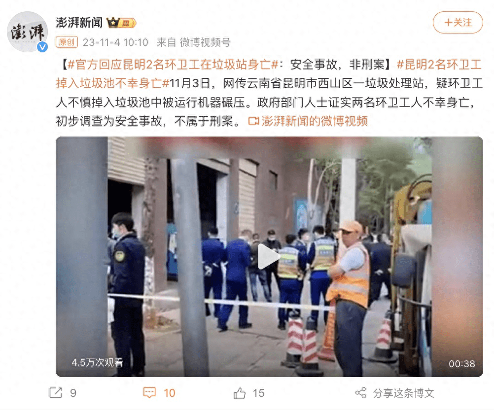 11月3日,网传云南省昆明市西山区一垃圾处理站,疑环卫工人不慎掉入垃圾池中被运行机器碾压。政府部门人士证实两名环卫工人不幸身亡,初步调查为安全事故,不属于刑案。