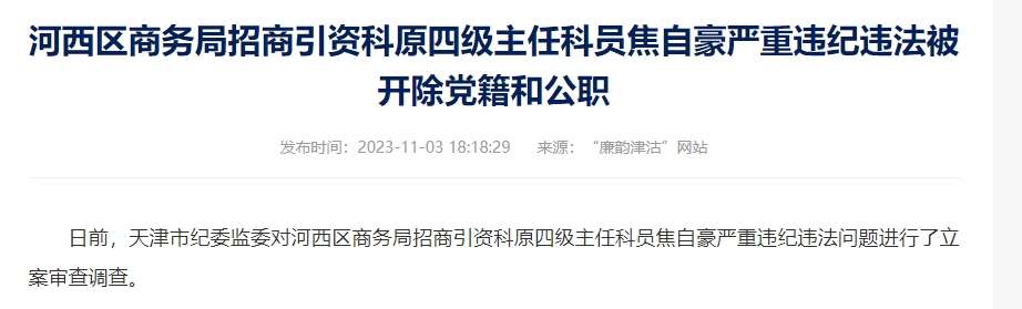 今年7月31日,天津市河西区商务局招商引资科四级主任科员焦自豪涉嫌严重违纪违法,被宣布正接受天津市纪委监委纪律审查和监察调查。