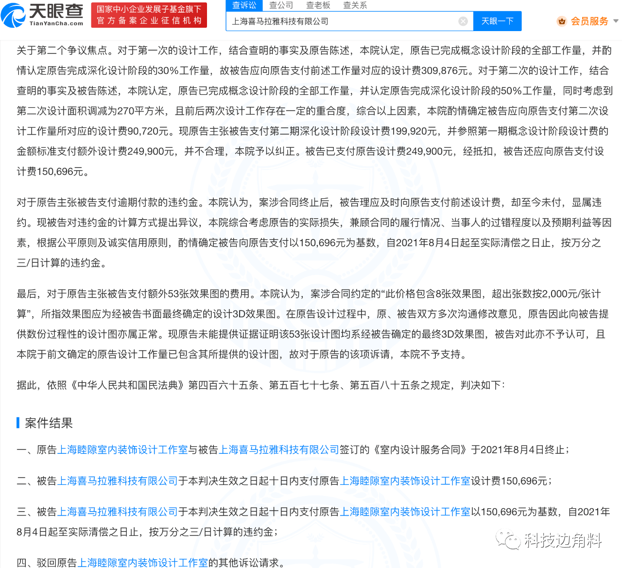 科技边角料获悉上海睦隙室内装饰设计工作室与上海喜马拉雅科技有限公司建设工程设计合同纠纷一审民事判决书日前公开,上海市闵行区人民法院判令喜马拉雅支付睦隙工作室设计费150696元及相关利息。