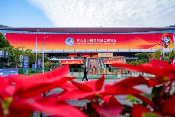 10月29日,第六届中国国际进口博览会场馆国家会展中心周围花团锦簇,盛会气氛浓厚/IC Photo