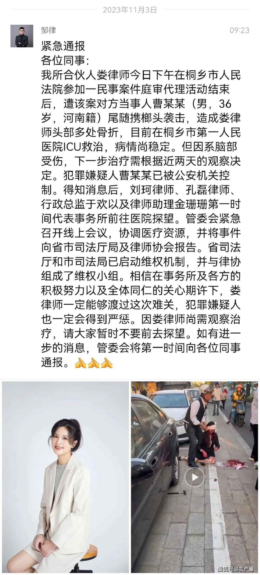 我所合伙人娄律师今日下午在桐乡市人民法院参加一民事案件庭审代理活动结束后,遭该案对方当事人曹某某(男,36岁,河南籍)尾随携榔头袭击,造成娄律师头部多处骨折,目前在桐乡市第一人民医院ICU救治,病情尚稳定。但因系脑部受伤,下一步治疗需根据近两天的观察决定。犯罪嫌疑人曹某某已被公安机关控制。得知消息后,刘珂律师、孔磊律师、行政总监于欢以及律师助理金珊珊第一时间代表事务所前往医院探望。管委会紧急召开线上会议,协调医疗资源,并将事件向省市司法厅局及律师协会报告。省司法厅和市司法局已启动维权机制,并与律协组成了维权小组。相信在事务所及各方的积极努力以及全体同仁的关心期许下,娄律师一定能够渡过这次难关,犯罪嫌疑人也一定会得到严惩。因娄律师尚需观察治疗,请大家暂时不要前去探望。如有进一步的消息,管委会将第一时间向各位同事通报。