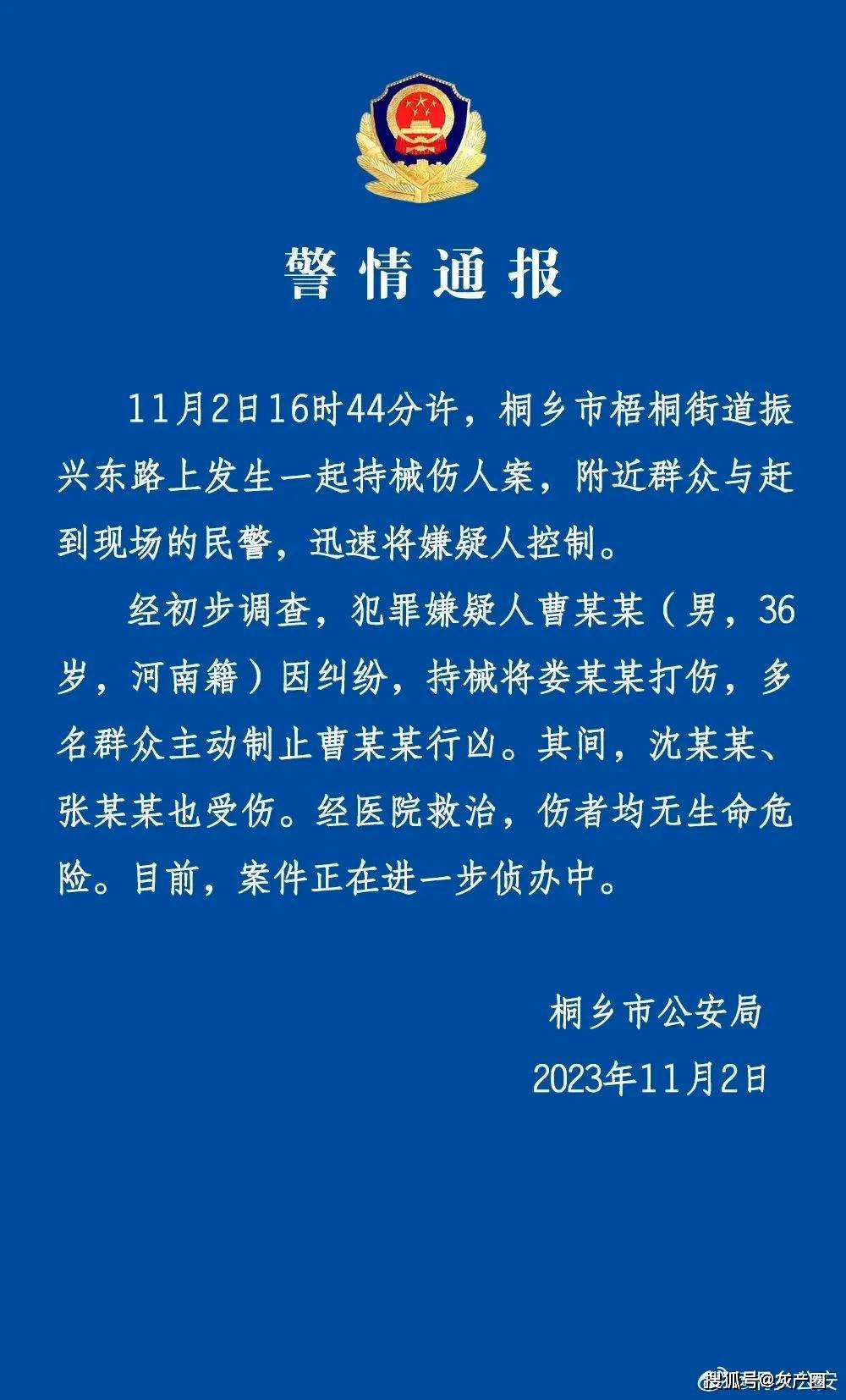 很快,桐乡市公安局就对这起持械伤人案做出了警情通报,经初步调查,犯罪嫌疑人曹某某(男,36岁,河南籍)因纠纷,持械将娄某某打伤,多名群众主动制止曹某某行凶。