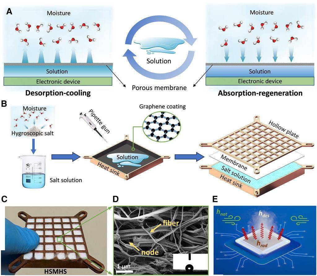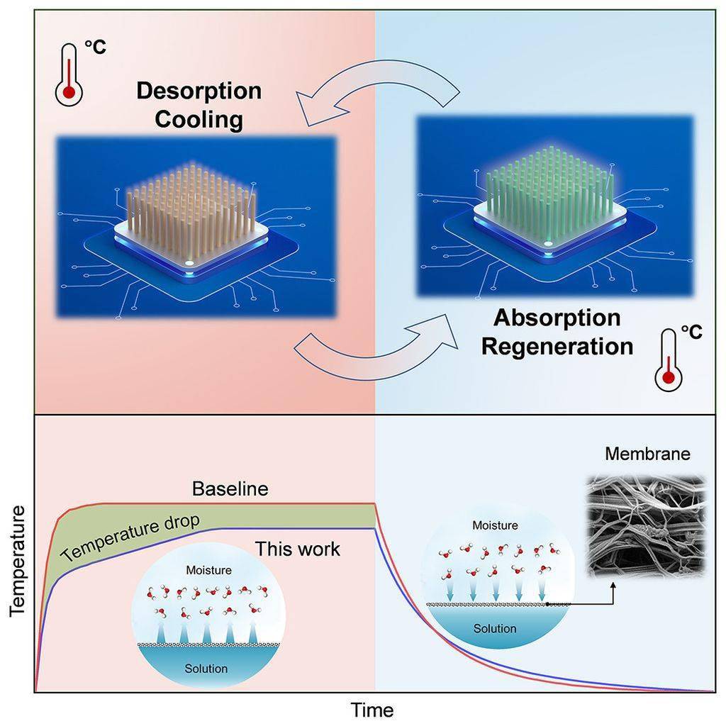 电子元件通过解吸盐溶液进行冷却 —— 水蒸气通过多孔膜蒸发,从而从冷却元件中带走热量,散热过程中通过直接从空气中吸收水分来补充供水。