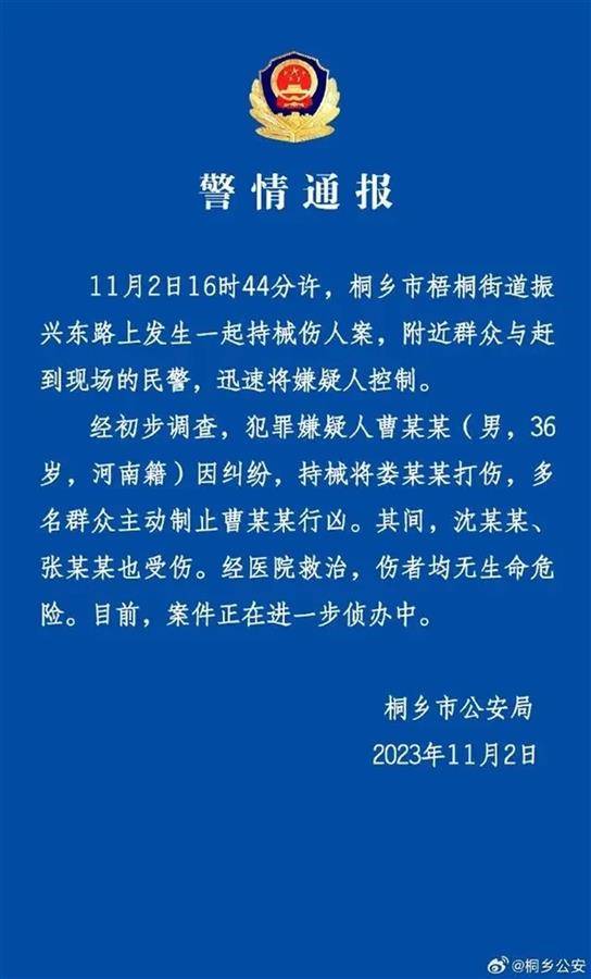 桐乡公安发布通报称嫌疑人已被控制(图片来源:桐乡公安)