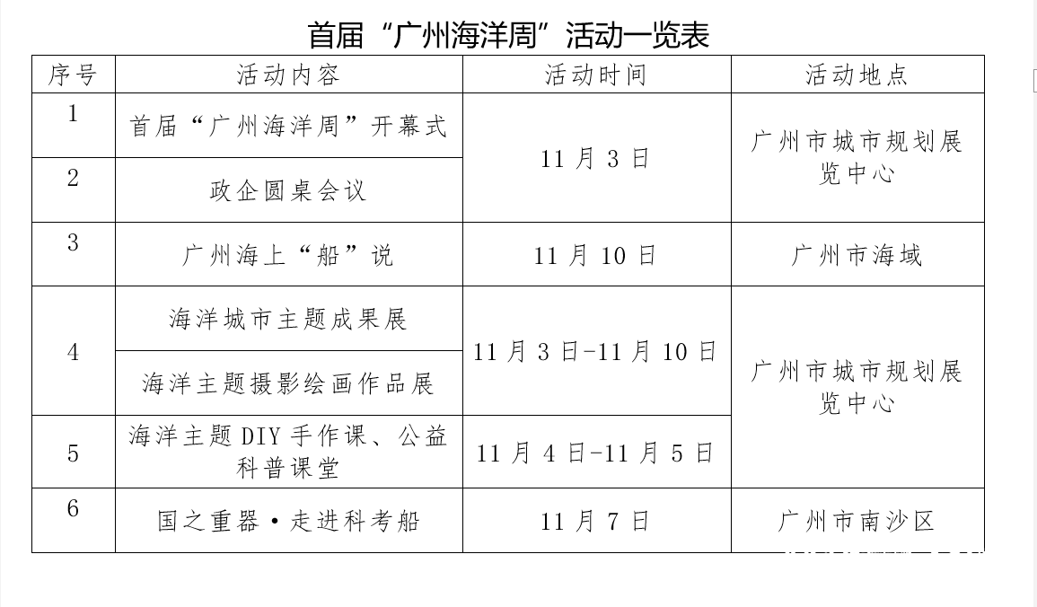 为打造一场兼具大众性、科普性、专业性的海洋盛会,“广州海洋周”期间,广州将举办包括“广州海上‘船’说”、海洋城市主题展览、海洋主题摄影绘画展、海洋科考船参观、海洋主题DIY手作课、公益科普课堂等在内的六大海洋主题活动,增强公众参与互动性,提升全民海洋意识。