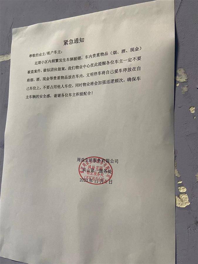在一旁的柱子上,记者看到一份物业公司张贴的紧急通知,“尊敬的业主/租车车主:近期小区频繁发生车辆被砸,车内贵重物品(烟、酒、现金)被盗案件,疑似团伙作案,我们物业中心在此提醒各位车主一定不要将烟、酒、现金等贵重物品放在车内,文明停车,将自己爱车停放在自己车位上,不要占用他人车位,同时物业将会加强巡逻频次,确保车辆车主的安全,谢谢各位车主的积极配合。”落款时间为2023年11月1日。