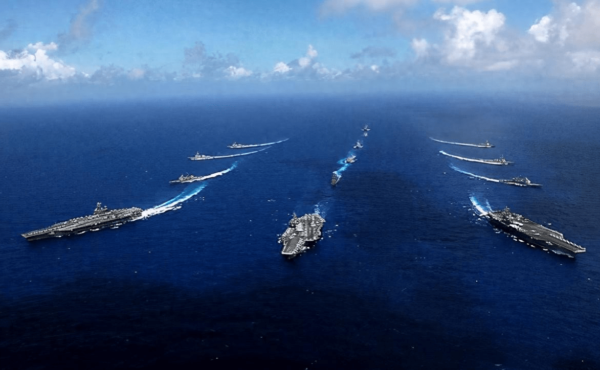 以福特级和尼米兹级的两艘核动力航空母舰为代表的打击群,他们由两艘导弹巡洋舰(CG-47菲律宾海号和CG-60诺曼底号)随行,至少六艘阿利伯克级驱逐舰和至少一艘低噪音弗吉尼亚级核动力导弹潜艇同行。