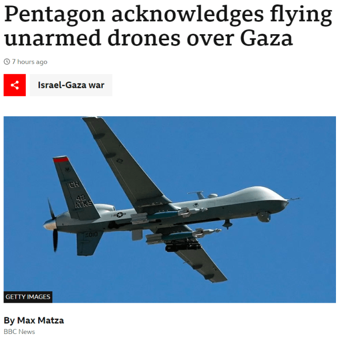 据英国广播公司等媒体报道,当地时间3日,五角大楼首次承认,美军向加沙上空部署了侦察无人机。