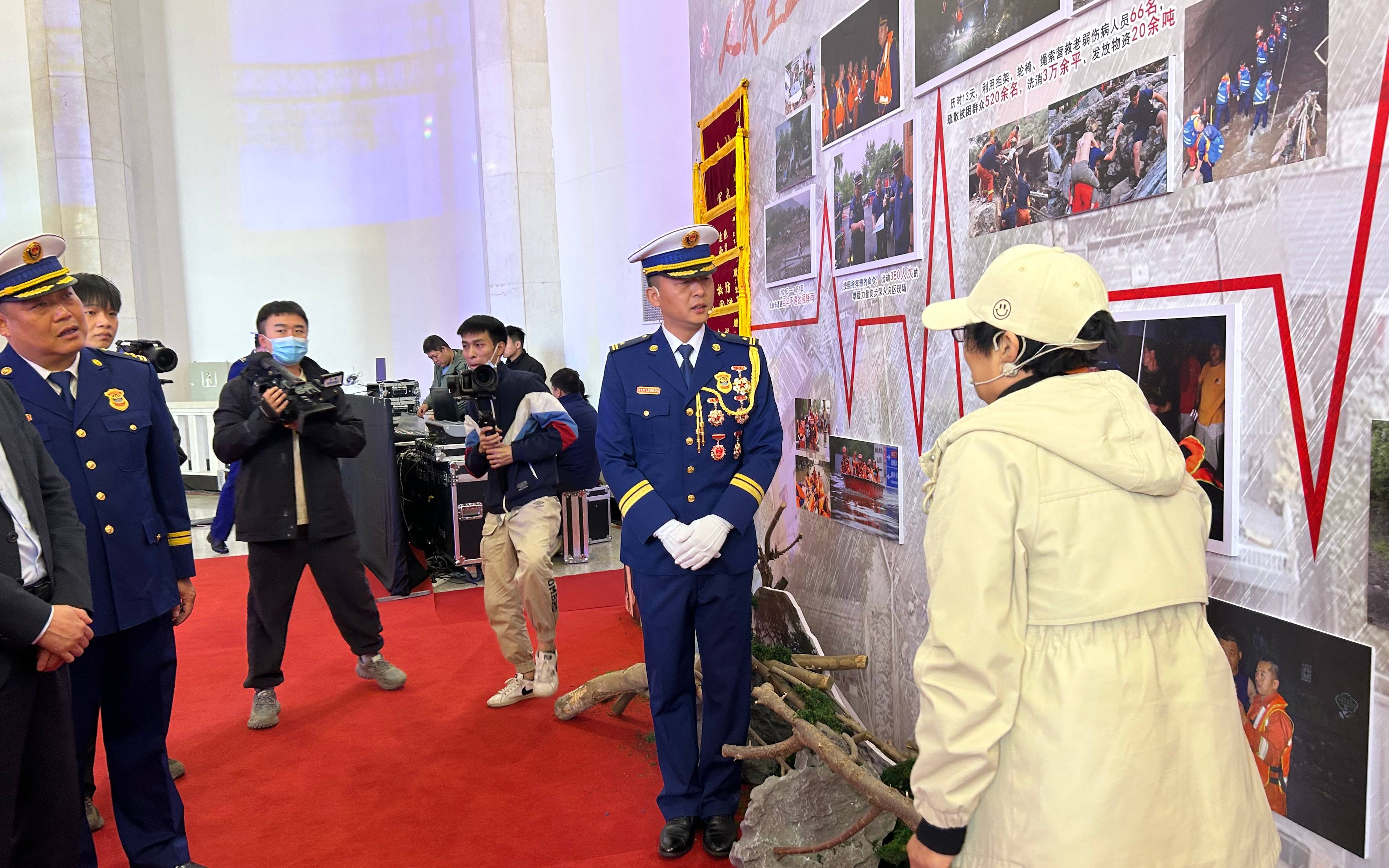 舞剧结束后,大家开始参观展馆内的消防基础建设成果展、抗洪救灾展、文创才艺作品展等,这些展出标志着西城区消防工作取得的进步和成绩。7月末,西城区消防救援支队战训处处长姚运春带队前往门头沟灾区进行支援,他向大家介绍7月末抗洪救灾的经过。支援期间,因为洪灾造成路面塌陷,交通受阻,姚运春带领消防员们一天走4万多步,疏散灾民,为灾民运送基本生活物资。门头沟区南港村的村委书记也带领部分村民来到了现场。见到姚运春,她哽咽着回忆起了那段简单的受灾时光,并对西城区消防救援支队表达了感谢,“很多消防员还是孩子呀,不舍得吃,把物资留给我们,我真的很心疼他们,等我们村建好了,欢迎大家再来玩。”
