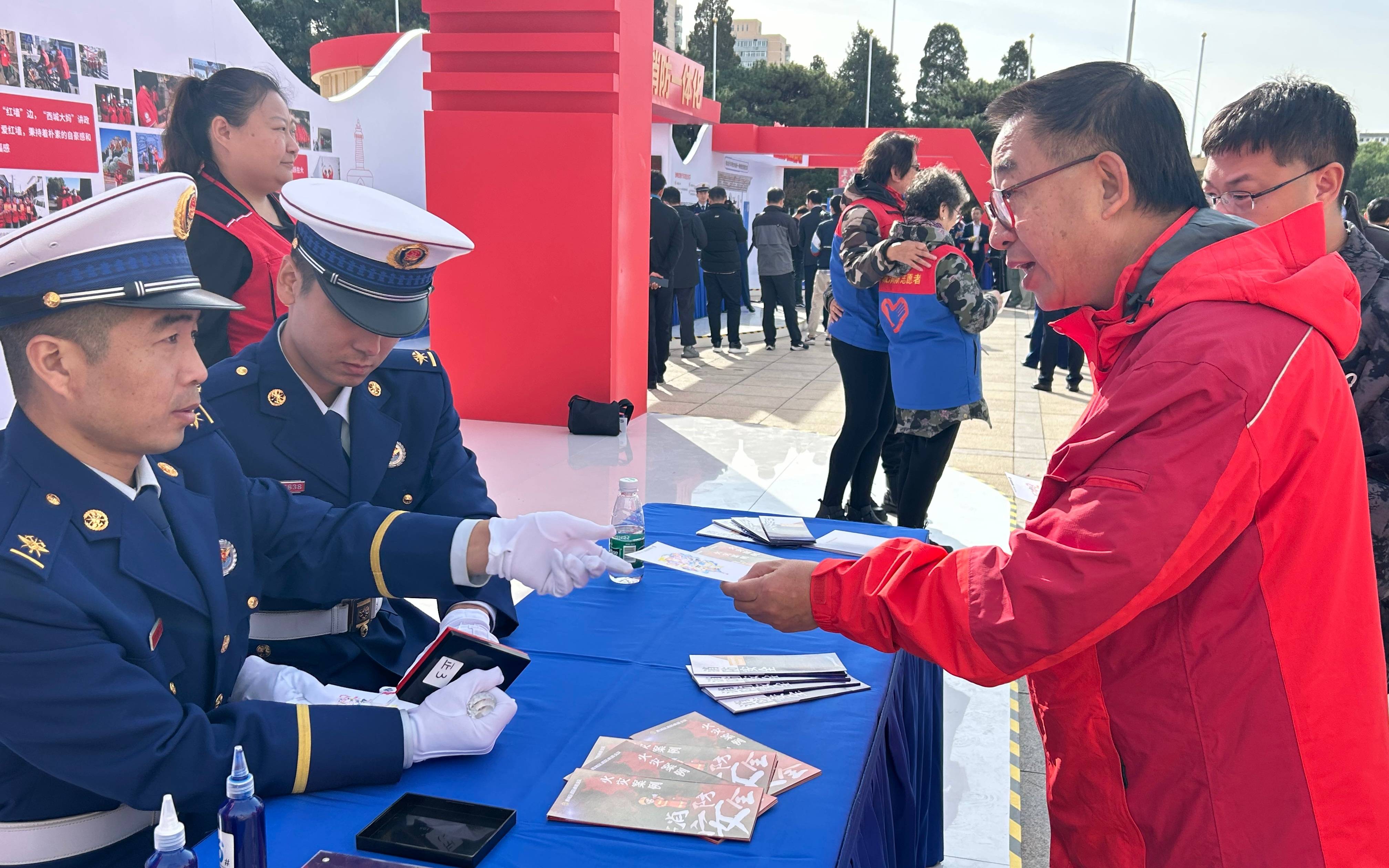 消防员为参观群众进行盖章。新京报记者 彭镜陶 摄