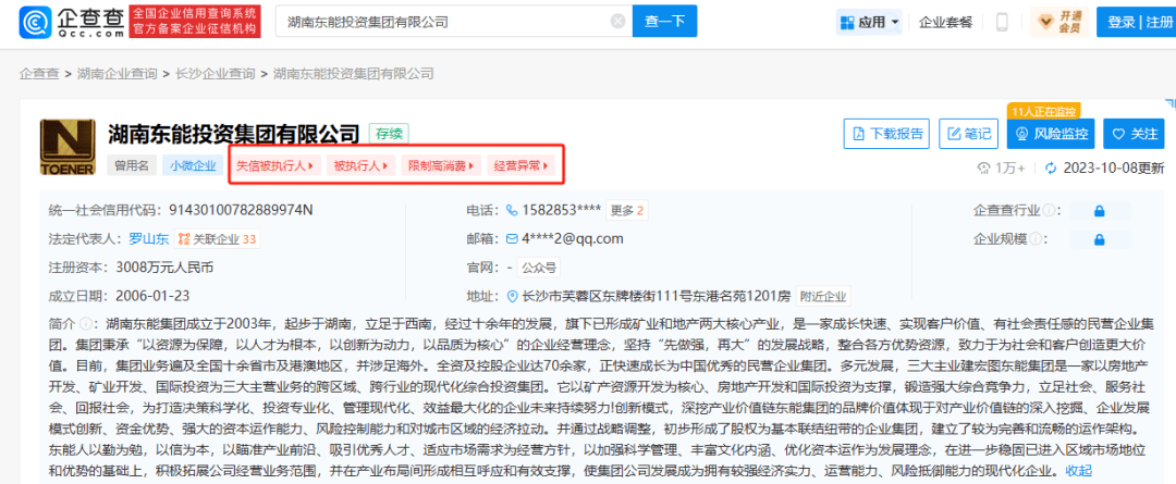 东能集团官网介绍显示,东能集团成立于2003年,起步于湖南、立足于西南,经过十余年的发展,旗下已形成矿业、地产、金融、资产管理四大核心业务,全资及控股企业达70余家。不过,目前该公司已被列上失信被执行人、限制高消费、经营异常等多个标签。