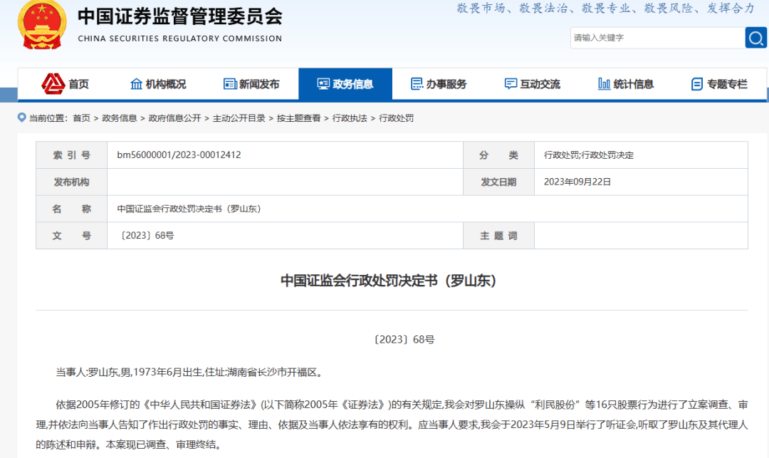 据证监会官网披露行政处罚信息显示,罗山东因操纵“利民股份”等16只股票。被证监会没收6898.83万元,并处以同等金额的罚款,合计罚没金额高达1.38亿元。
