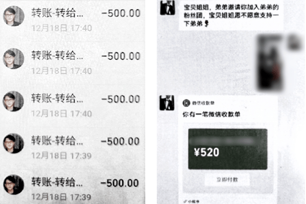 经了解:从2022年2月开始,张阿姨就在群里不断给一个叫“靳东”的用户充值打赏,不久后“靳东”就以谈恋爱的名义加上了张阿姨的微信。张先生提供的聊天记录中能找到许多“老婆”“我会娶你”“我想你了”等字眼。而张阿姨也在“偶像”一声声甜蜜的“宝贝”中逐渐沦陷,以至于到案发,张阿姨仍不相信网络上那个温柔体贴的帅气男星会是儿子口中的“诈骗犯”……