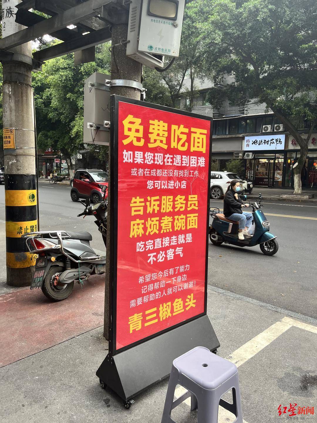 ▲三碗面餐馆门口挂出“免费吃面”的招牌