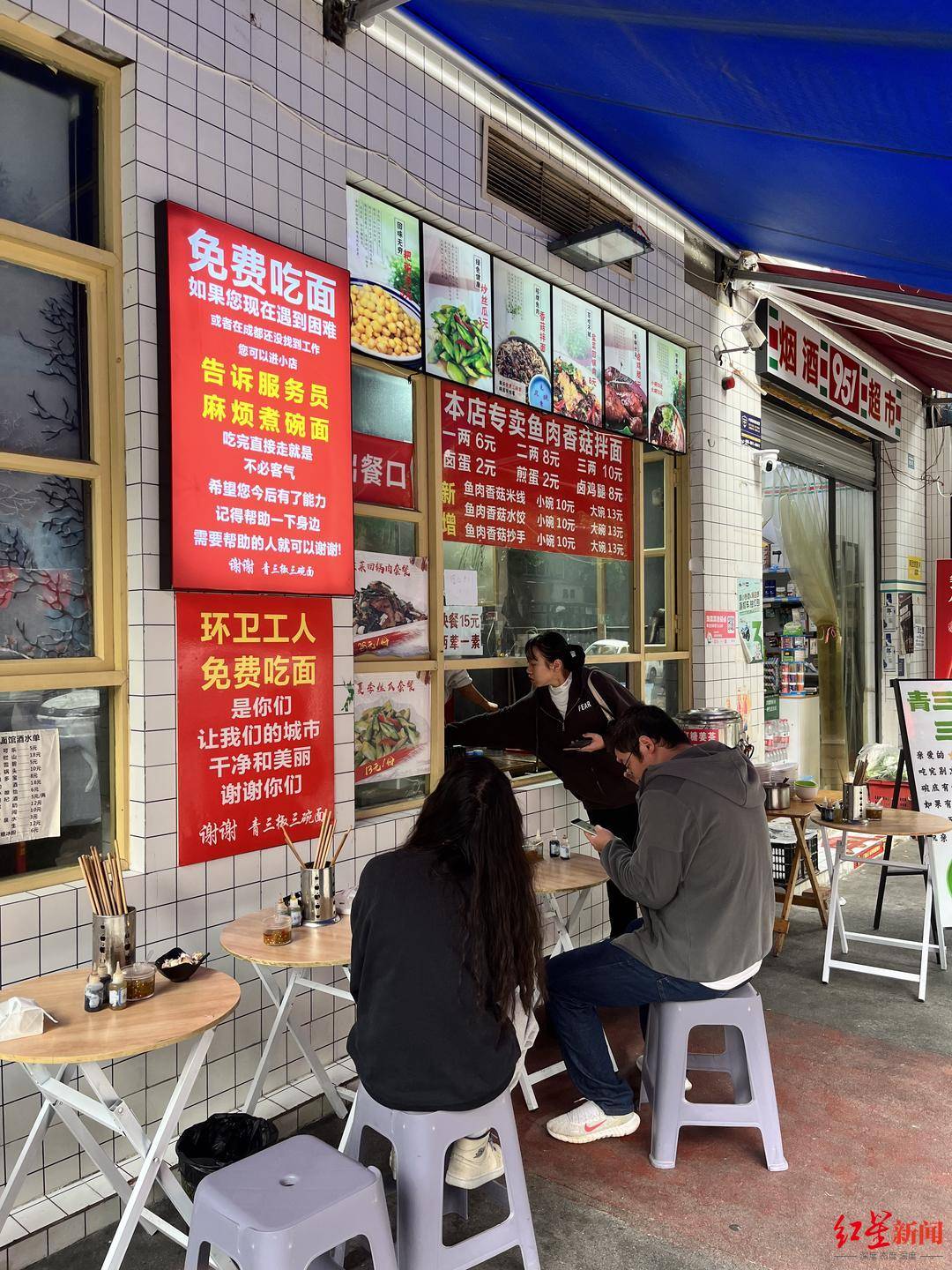 落款是一家火锅鱼餐馆,老板黄明介绍,自己的火锅鱼餐馆已经开了13年。旁边的三碗面面店也是黄明的餐饮店。“免费吃面”被显示在火锅鱼餐馆和面馆招牌的醒目处。一旁还有夏季为户外工作者专供的爱心冰柜,以及环卫工人爱心休息站。