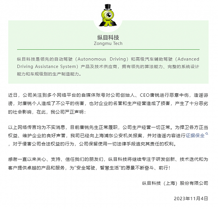 鞭牛士 11月4日消息,针对近日网传的「纵目科技CEO唐锐被投资人找黑社会从美国抓回」的消息,今日,自动驾驶公司纵目科技发布声明表示,系造谣诽谤,目前唐锐正常履职,公司生产经营一切正常。同时,公司已经向上海浦东公安机关报案,并对造谣内容进行证据保全,对于侵害公司合法权益的行为,公司保留使用一切法律手段追究其责任的权利。