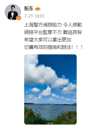 此次侦办案件的过程中,靳东本人也曾亲自发博,直言“仍然需要更多切实有效的措施和办法”。