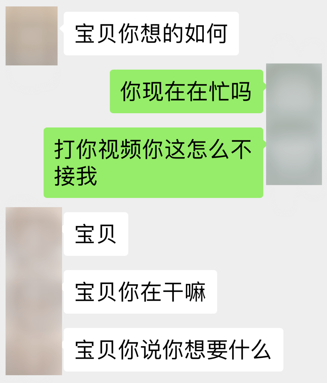 从2022年2月开始,张阿姨就在群里不断给一个叫“靳东”的用户充值打赏,不久后“靳东”就以谈恋爱的名义加上了张阿姨的微信。张先生提供的聊天记录中能找到许多“老婆”“我会娶你”“我想你了”等字眼。而张阿姨也在“偶像”一声声甜蜜的“宝贝”中逐渐沦陷,以至于到案发,张阿姨仍不相信网络上那个温柔体贴的帅气男星会是儿子口中的“诈骗犯”……