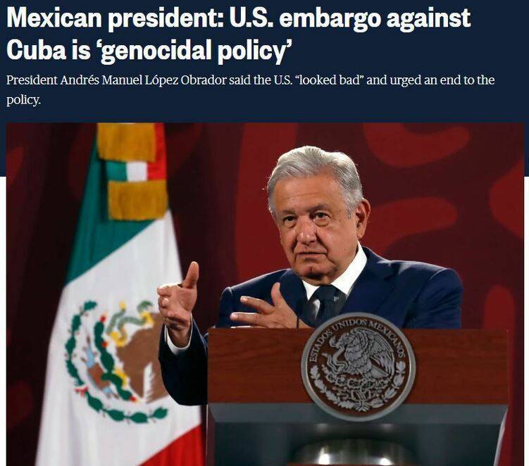 墨西哥总统洛佩斯也多次呼吁美国尽快解除对古巴人民的不公正和不人道的封锁,称美国对待古巴的方式很糟糕,“这是一项种族灭绝政策”。