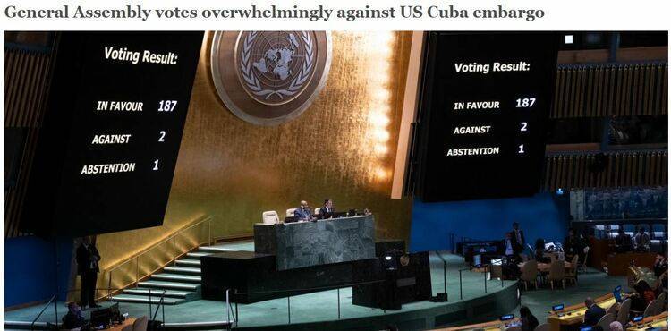 自1992年起,联大每年都就古巴提交的关于终止美国对其封锁的决议草案进行表决,唯一例外是2020年受新冠疫情影响这一问题的讨论被推迟到次年。
