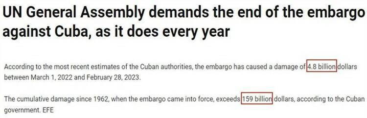 据有关统计,美国封锁60多年累计对古巴造成近1600亿美元损失,几乎覆盖了所有民生领域,导致了严重的人道主义灾难。仅2022年3月至2023年2月给古巴造成的损失就多达48.67亿美元,相当于古巴全体民众三年的口粮费用。