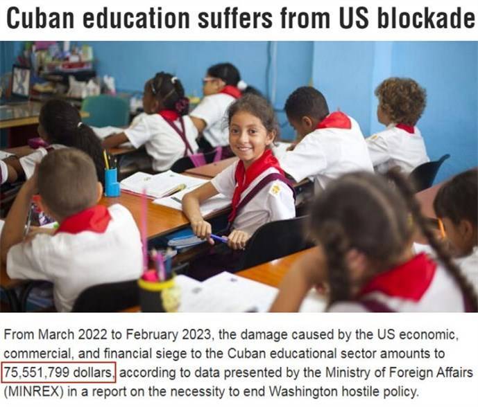 根据古巴外交部近日公布的数据,2022 年 3 月到 2023 年 2 月,美国的封锁已经导致古巴教育部门损失超过7555万美元,古巴各级学校无法获得足够的课本和学习材料,各类学术交流活动也无法进行。