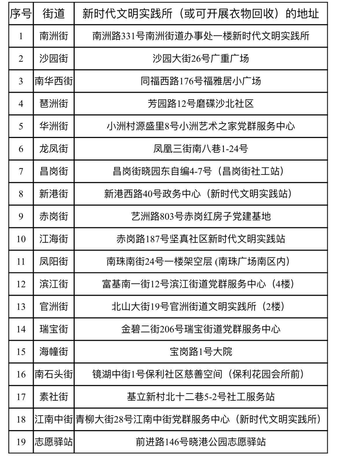 此外,街道社区回收点将会在11月4日至5日的10:00-12:00,14:00-18:00开放。140余所中小学校将在11月6日至10日面向在校师生集中开展为期5天的旧衣回收工作,海珠区“青年地带”社工还将进校宣讲垃圾分类知识。此外,海珠区内40多个园区、商业楼宇、企业也将在11月6日至7日面向在职员工进行旧衣集中回收。