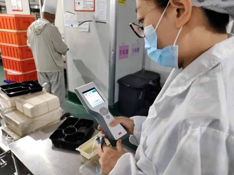 监管人员对餐盒进行快速检测