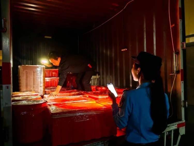 凌晨4点多,位于繁安路618号的龙神餐饮桶盒饭生产加工厂一派忙碌景象,区市场监管局的监管人员正对车辆封签上锁,伴随一声“出发”,第一车新鲜出炉的餐品将被送往进博会场馆,送到“小叶子”们的手中。
