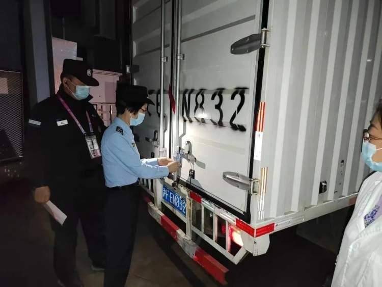 当餐食全部搬上进博会供餐专用车辆后,监管人员再次确认品种数量和运输条件,使用进博专用封签进行加封,确保运输环节食品安全。