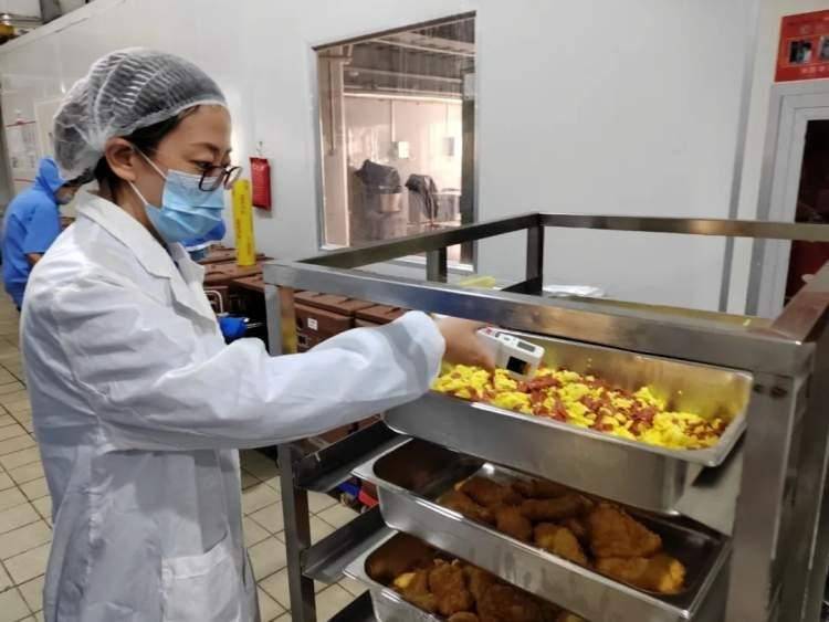 随着一份份热腾腾的餐食制作完成,监管人员对餐食中心温度进行检测,确保达到75℃以上方可进入运输环节。