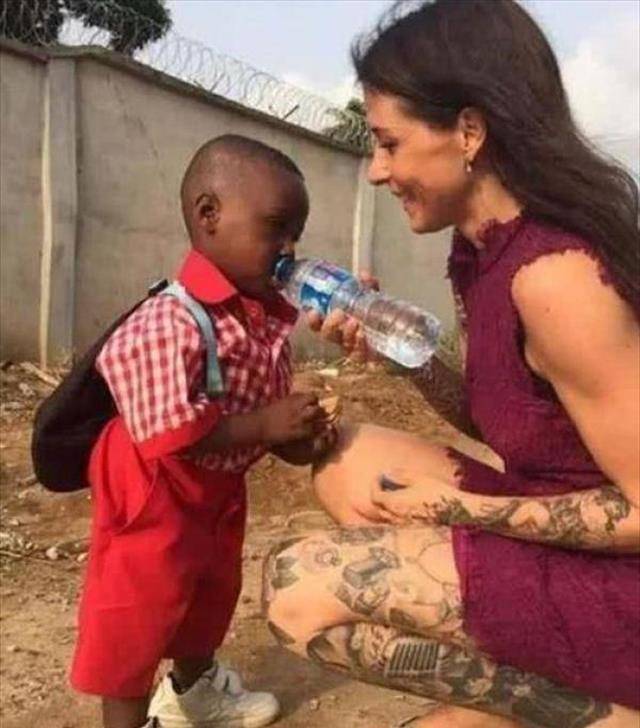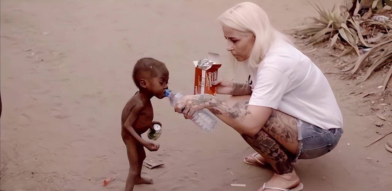 Anja看着小男孩完全没有生机的样子,心都被揪了起来,眼前瘦弱的孩子带给她太大的震撼,在此之前,她都无法想象这么小的一个孩子竟然饿成这歌样子,于心不忍的她迅速拿出自己包里的水和面包,递给了小男孩。