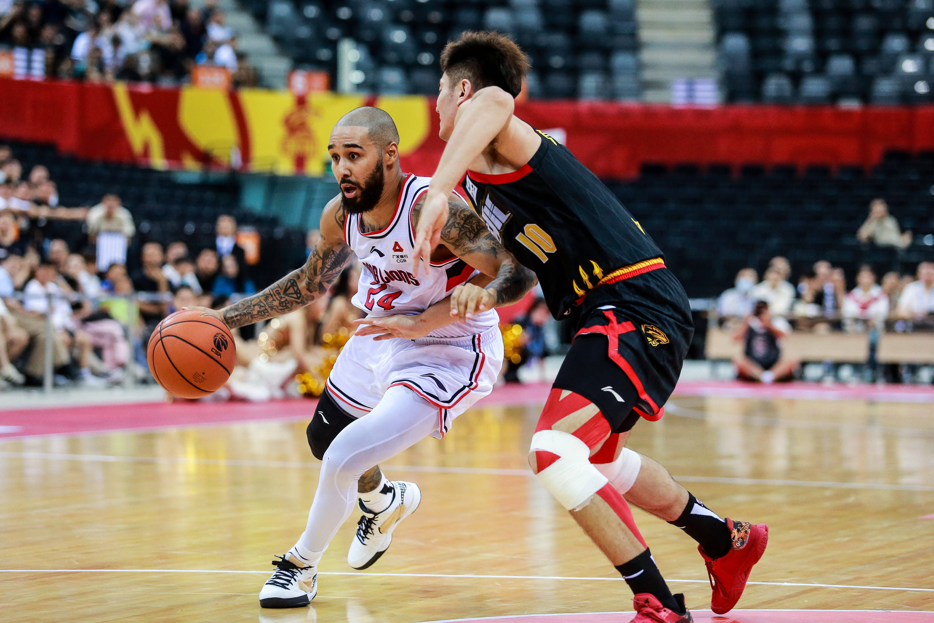 11月4日,广州龙狮队球员摩尔(左)在比赛中突破。新华社发(彭志刚 摄)