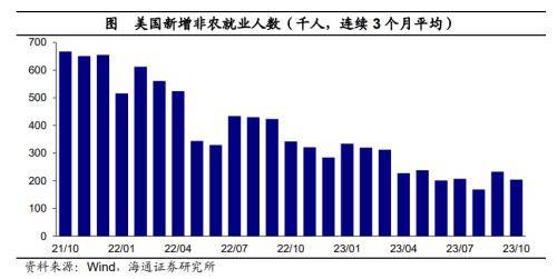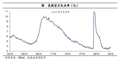 失业率小幅抬升。10月美国劳动力参与率为62.7%,较上一月下滑0.1个百分点,与疫情前(2020年2月)约有0.6个百分点的缺口。10月失业率上升为3.9%,为2022年1月以来高点,不过整体来看仍处于相对低位。