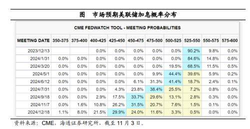 短期来看,美国核心通胀压力有望继续缓解,劳动力市场相对稳定,美联储大概率将结束加息。(参考报告:《加息周期的尾声——美联储11月议息会议点评》)根据CME观察显示,截至11月3日,市场预期美联储在12月大概率不加息。