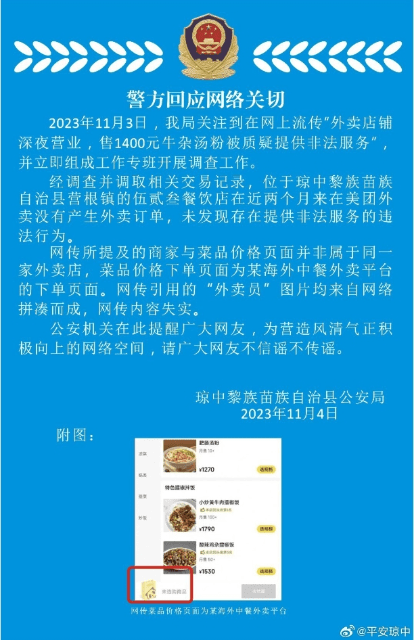 11月4日晚间,海南省琼中黎族苗族自治县公安局回应网络关切:2023年11月3日,我局关注到在网上流传“外卖店铺深夜营业,售1400元牛杂汤粉被质疑提供非法服务”并立即组成工作专班开展调查工作。