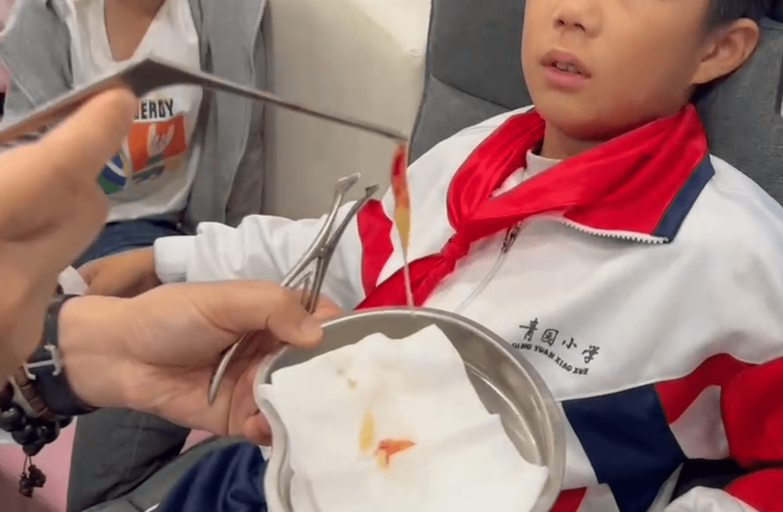 家长提供的视频截图显示,一名小学生做完“消鼻甲”后,从鼻腔内取出的物体。